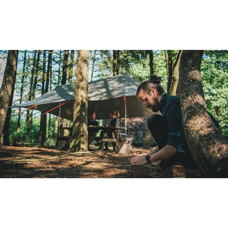 Cette bâche robuste et durable a des poteaux réglables. Sa forme unique offre une protection contre la pluie des deux côtés.