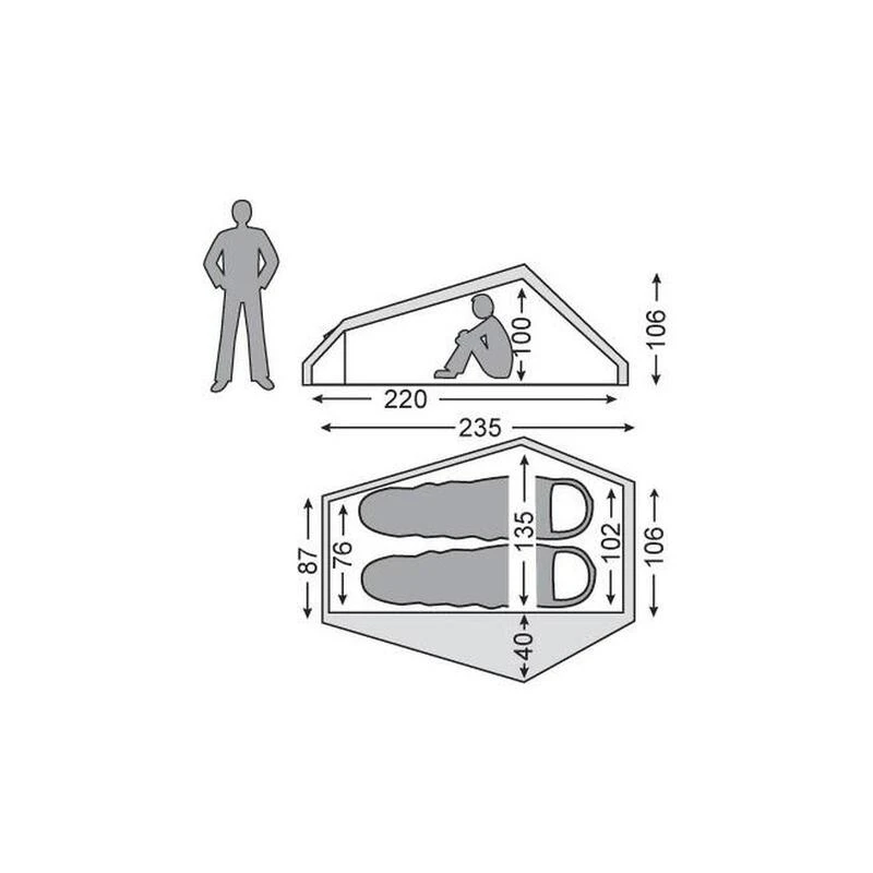 Tente de randonnée pour 2 personne. Armature en aluminium et double toit en tissu nylon ripstop SI. Poids : 950 g