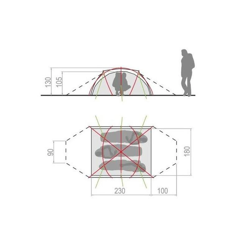 Tente de rando 3 personnes – 5 saisons. Armature aluminium DAC 10,25 mm et double toit en polyamide et polyester 30/40D. Poids : 4,79 kg